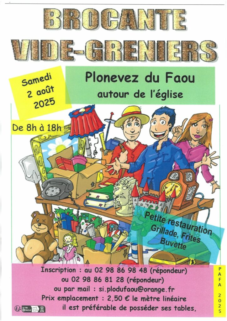 Vide-grenier au bourg organisé par le PAFA Cet événement est terminé. Date 2 août 2025 Heure 8h00 - 18h00